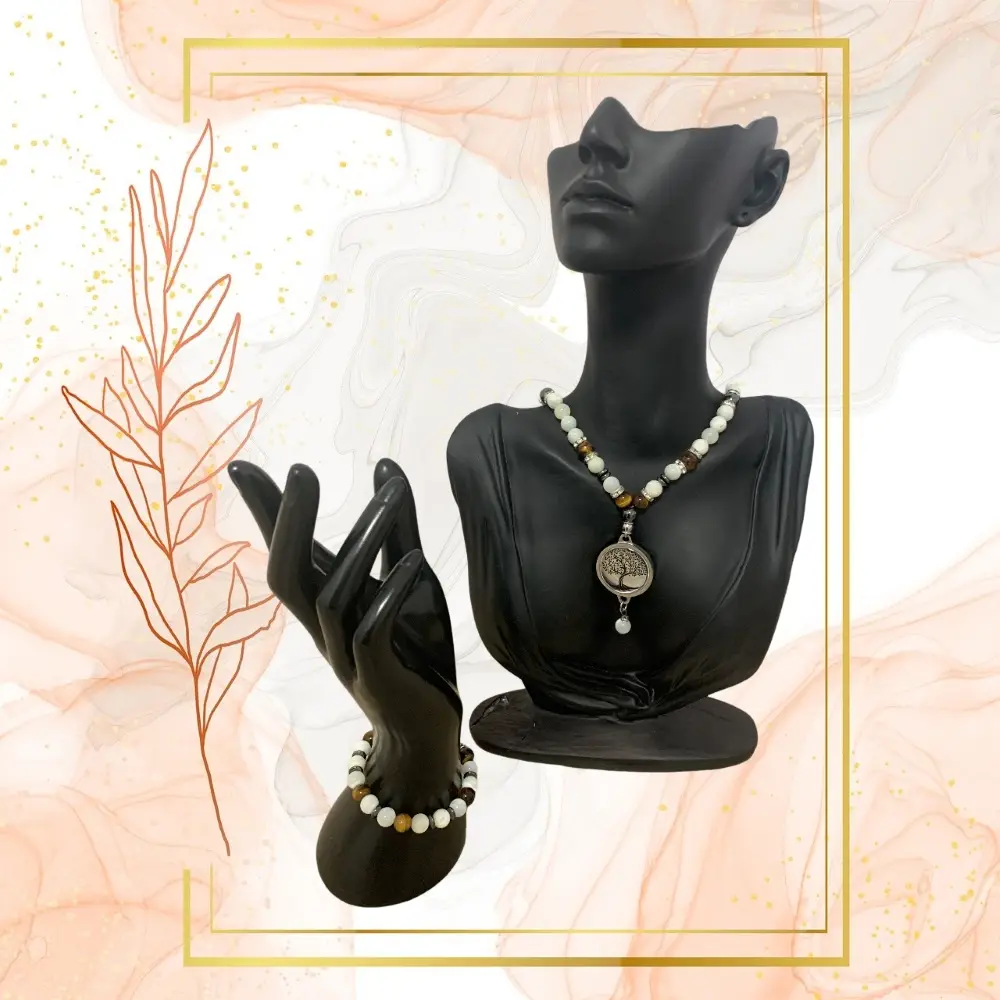 TAILLE: 18CM, VISUEL: ARBRE DE VIE, TAILLE COLLIER: 52 CM Pourquoi des bracelets ou des colliers anti-ondes ? Les ondes électro-magnétiques et leurs méfaits deviennent de plus en plus un sujet de santé publique. Les champs électro-magnétiques peuvent en effet avoir des conséquences sur la santé des personnes exposées. Leurs effets sur lorganisme peuvent être directs lorsquon est en contact avec lappareil émetteur dondes (ex : téléphone portable ou sans fil provoquant un échauffement des tissus biologiques) ou indirects quand on est dans une pièce où se trouvent des appareils en wifi (ex : stimulation du système nerveux, troubles visuels ). Quel que soit le type de champ électro-magnétique, les symptômes rapportés sont nombreux : asthénie physique ou musculaire voire douleurs musculaires, fatigue, pertes de mémoire, apathie contrastant avec une irritabilité anormale, troubles du sommeil, maux de tête, vertiges, malaises Dautres risques bien plus graves sont évoqués mais restent à ce jour sujets à controverse (Dossier INRS Champs électromagnétiques disponible sur demande). Dans ce contexte, le législateur sest emparé de cette problématique, et un certain nombre de recommandations ont été faites afin de protéger les salariés sur leur lieu de travail (Décret no 2016-1074 du 3 août 2016 relatif à la protection des travailleurs contre les risques dus aux champs électromagnétiques, disponible sur demande). Pour rappel, les émetteurs de champs électromagnétiques nocifs sont : – Antennes relais, compteurs Linky – Appareils wifi, appareils connectés, caméras de surveillance, box wifi – Ordinateurs, tablettes, smartphones Ce collier anti-ondes en pierres « Nacre », il de tigre », et « Hématite » vous garantit une protection individuelle parfaite contre les rayonnements électromagnétiques et un bien-être accru grâce aux bénéfices des pierres naturelles qui le composent. Modèles de patchs anti-ondes : Ying Yang, Waves & Arbre de vie Taille du patch : 25mm Tailles de collier disponibles : 42cm & 52cm Il est complété dun bracelet en pierres « Nacre », « il de Tigre » et « Hématite » 3 tailles : 18, 19 & 20cm. DESCRIPTION Ce collier anti-ondes est composé dun patch de 64 modules dantennes placés dans un circuit imprimé en 8 couches formant un « Multi-Déphaseur tridimensionnel » utilisant lénergie des ondes pour produire de multiples échos permettant aux cellules vivantes de distinguer clairement et de rejeter les fréquences toxiques des ondes électromagnétiques produites par les technologies de la vie quotidienne. Il est fait de pierres naturelles en Nacre, il de tigre, Hématite et strass, toutes certifiées. Il est complété par un bracelet composé de pierres naturelles, Nacre, il de tigre, dhématites toutes certifiées et de strass. Il est réalisé à la main en France par notre artisan créateur Flora. CARACTERISTIQUES Acier inoxydable pour le dispositif anti-ondes 33 pierres en Nacre, 16 il de Tigre, 3 Hématites Technologie Brevetée 3 modèles disponibles : Waves, Ying Yang et Arbre de Vie 2 tailles disponibles : 42cm et 52cm Réalisation à la main en France CARACTERISTIQUES BRACELET 14 Nacre, 6 il de tigre,2 Strass et espaceurs en hématite. 3 tailles disponibles : 18,19 et 20cm Pour information: BIENFAITS DE LA NACRE La nacre, aussi connue sous le nom de « mother of pearl » en anglais, est une substance organique-inorganique produite par certains mollusques comme les huîtres et les abalones. Elle est prisée non seulement pour sa beauté irisée mais aussi pour ses bienfaits en lithothérapie et ses usages traditionnels. Voici quelques-uns des bienfaits attribués à la nacre : Apaisement émotionnel : La nacre est souvent utilisée pour ses propriétés apaisantes. Elle est réputée pour calmer les émotions, réduire le stress et favoriser un état d’esprit serein. Promotion de la guérison : En lithothérapie, la nacre est considérée comme une pierre de guérison. Elle est censée aider à régénérer les tissus, favoriser la cicatrisation et améliorer l’état général de santé. Renforcement de l’intuition : La nacre est associée à l’intuition et à la sagesse intérieure. Elle est souvent utilisée pour stimuler l’imagination et favoriser une meilleure compréhension spirituelle. Équilibre émotionnel : La nacre est également réputée pour aider à équilibrer les émotions. Elle peut aider à apaiser les sautes d’humeur et à stabiliser les sentiments négatifs. Protection et purification : Certaines traditions considèrent la nacre comme une pierre protectrice qui peut aider à purifier l’environnement et à éloigner les énergies négatives. Amélioration des relations : En favorisant la communication et l’harmonie, la nacre est souvent utilisée pour améliorer les relations personnelles et favoriser une meilleure compréhension mutuelle. Stimulation de la créativité : La beauté irisée de la nacre est parfois associée à une stimulation de la créativité et de l’inspiration artistique. BIENFAITS DE LIL DE TIGRE La pierre Oeil de tigre est souvent utilisée en lithothérapie, une pratique qui suppose que certaines pierres et certains cristaux peuvent offrir des bénéfices pour la santé et le bien-être. Cependant, il est important de noter que ces croyances ne sont pas soutenues par la médecine conventionnelle. Voici quelques-uns des bénéfices pour la santé traditionnellement associés à l’Oeil de tigre : Réduction du stress et de l’anxiété : On dit souvent que l’Oeil de tigre aide à calmer l’esprit, réduire le stress et l’anxiété et favoriser un sentiment de paix intérieure. Amélioration de la confiance en soi : Cette pierre est censée renforcer la confiance en soi et l’estime de soi, en aidant à l’équilibre émotionnel et en encourageant une vision plus positive de la vie. Protection contre les énergies négatives : Beauco