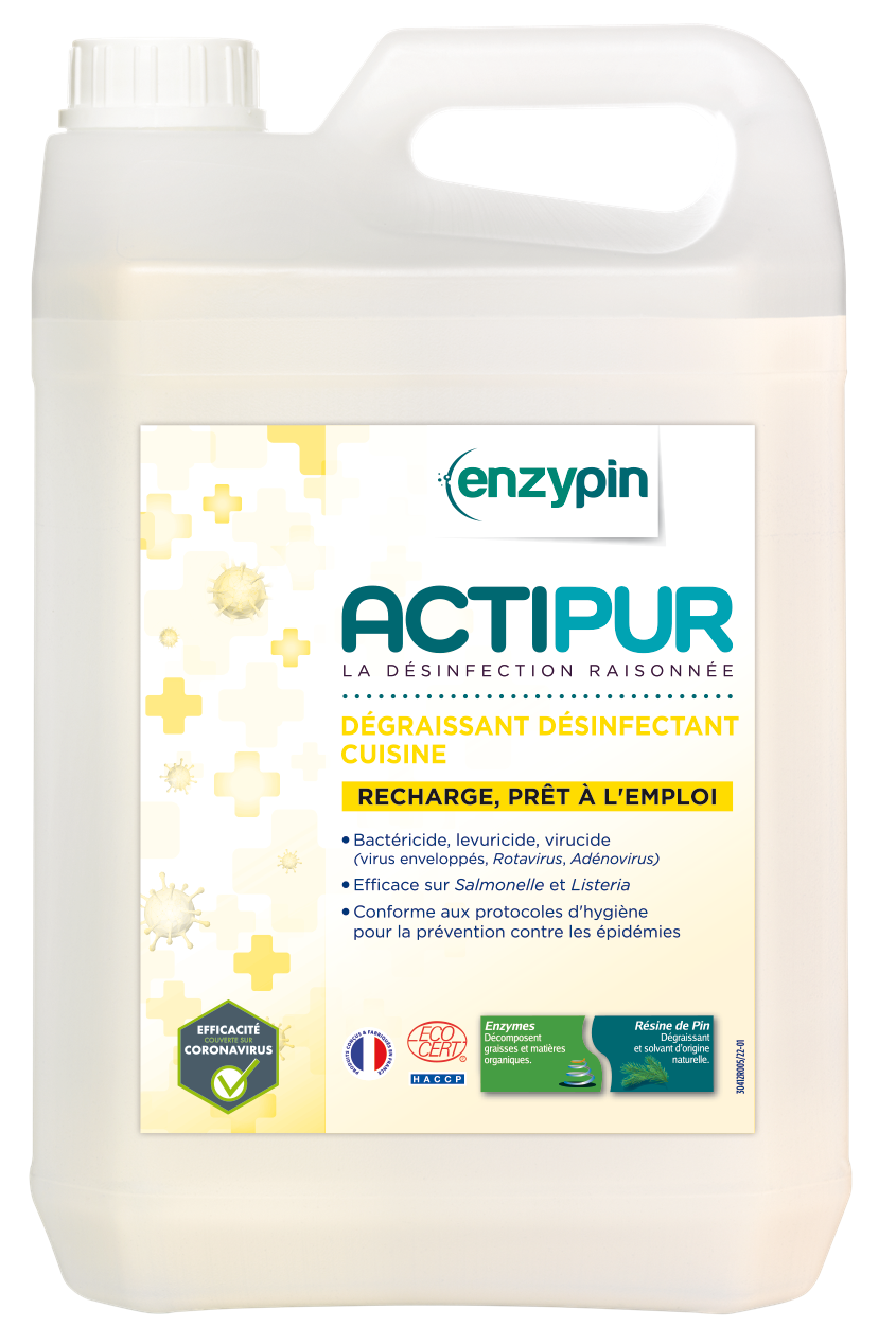 Le vrai professionnel actipur désinfectant cuisine prêt à l’emploi désinfectant cuisine labellisé 5l Formule biotechnologique à large spectre, idéale pour nettoyer, dégraisser et désinfecter les surfaces en univers alimentaire. Dégraissant désinfectant prêt à l’emploi efficace sur toutes les surfaces en univers alimentaire. Bactéricide, levuricide, action virucide*, efficace sur Salmonelle et Listeria. Fait briller les inox les surfaces de la cuisine sans laisser de trace. 99,3% d’ingrédients d’origine végétale et minérale. Certifié par ECOCERT Greenlife selon le référentiel ECOCERT « Ecodétergent ».