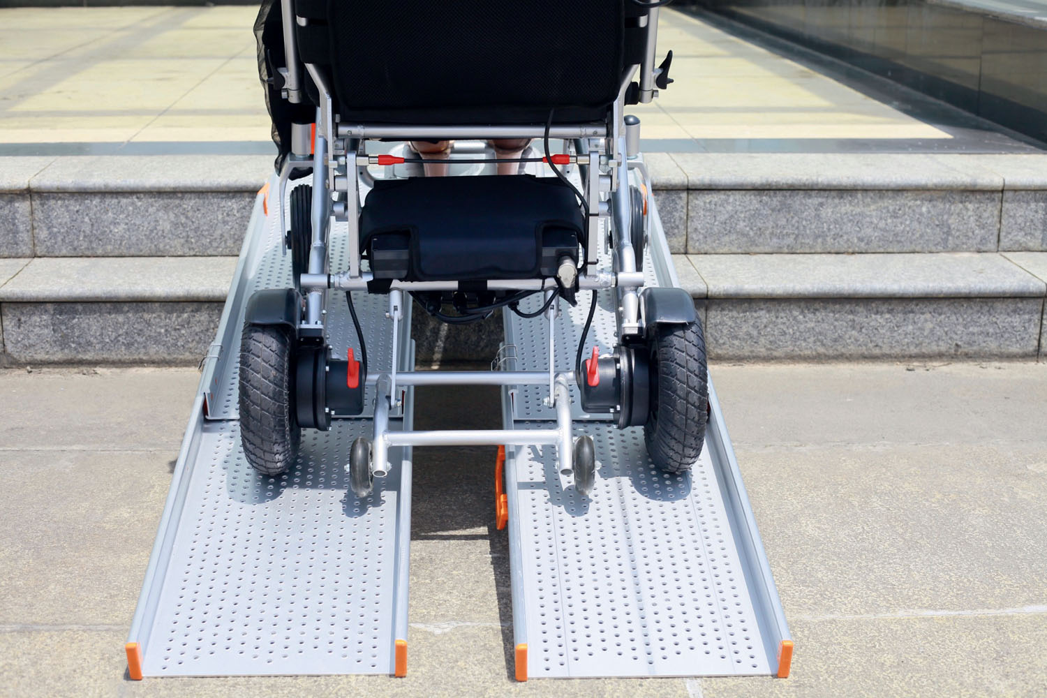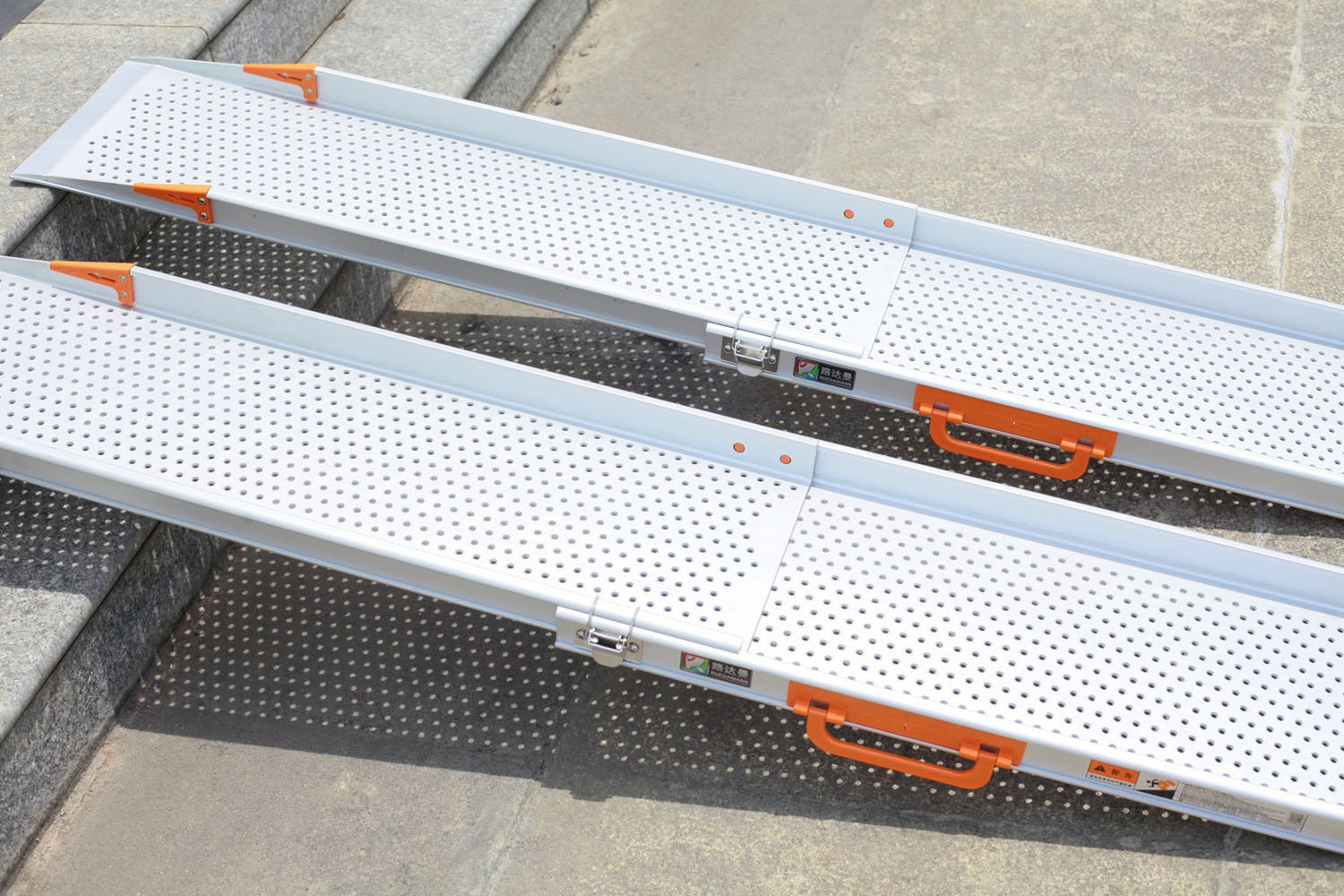 Paires de rampes extra-larges Ergo permettant une utilisation sécurisée pour des fauteuils électriques ou scooters à large bandages. Ses extrémités effilées (angle très ouvert) permettent de virer plus facilement à la fin de la montée. Longueur réglable au centimètre près grâce au système unique de verrouillage. Structure aluminium perforée pour évacuer l’eau. Largeur hors-tout : 30 cm, largeur de passage : 25,5 cm. Modèle : 121 cm réglable de 81,5 à 121 cm. Poids de la paire : 8,4 kg. Poids maximum supporté : 300 kg. Taille : 121 cm