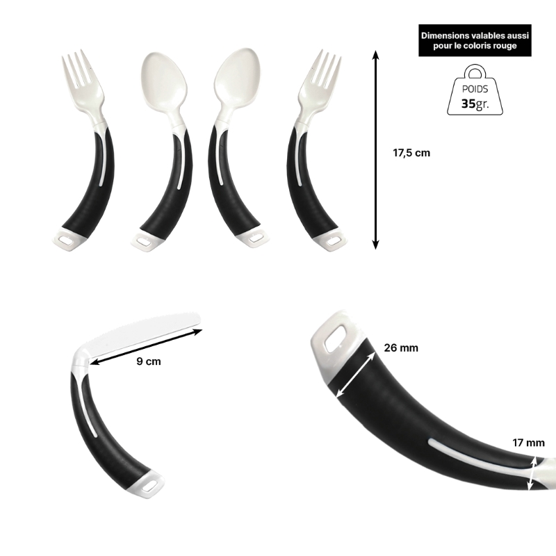 Les couverts de la gamme Plasti-Grip ont été conçus pour les mains plutôt petites, enfants, adolescents mais aussi adultes. Leur manche antidérapant permet un maintien facile et sécurisant. Le couvert en plastique est très sécurisant au quotidien. Garantie lave-vaisselle jusqu’à 70°. 2 coloris disponibles avec courbures droitier ou gaucher au choix. Longueur 17,5 cm. Diamètre de 17 à 26 mm. Longueur de la lame du couteau 9 cm. Poids 35 gr. Il est possible d’ajouter aux couverts Plasti-Grip une dragonne en option