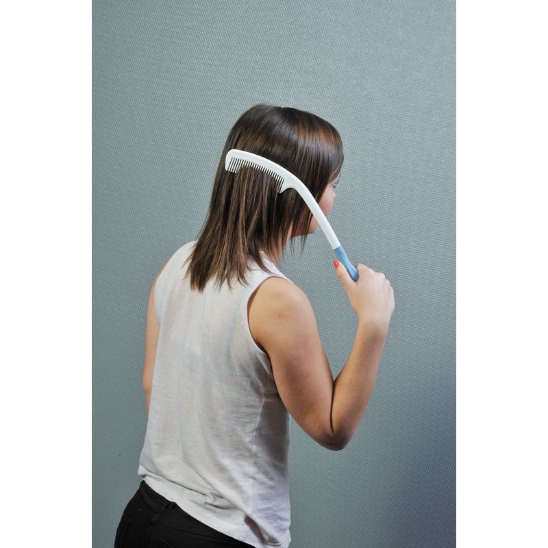 Ce peigne à long manche permet de vous coiffer sans faire de grands gestes. Manche ergonomique souple sans latex. Ensemble lavable. Longueur 40 cm environ.